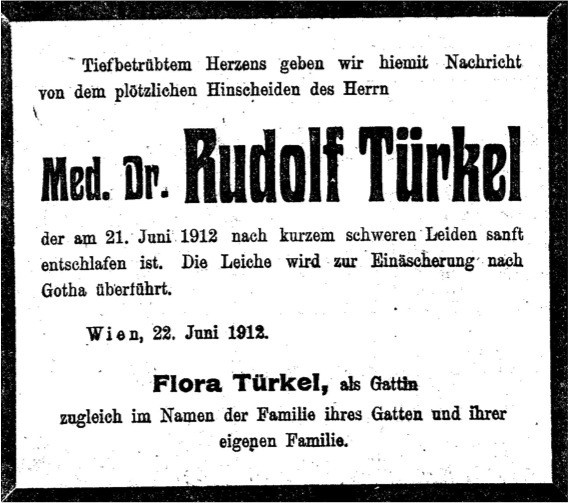 Rudolf Türkel wurde als Sohn des Kaufmannes Johann Türkel (1833-1909) und Emilie (1849-1907), geborene Rosenberg, am 8. April 1878 in Wien geboren. Seit 1905 war er mit Flora Deutsch (1885-1942 KZ Majdanek) verheiratet.