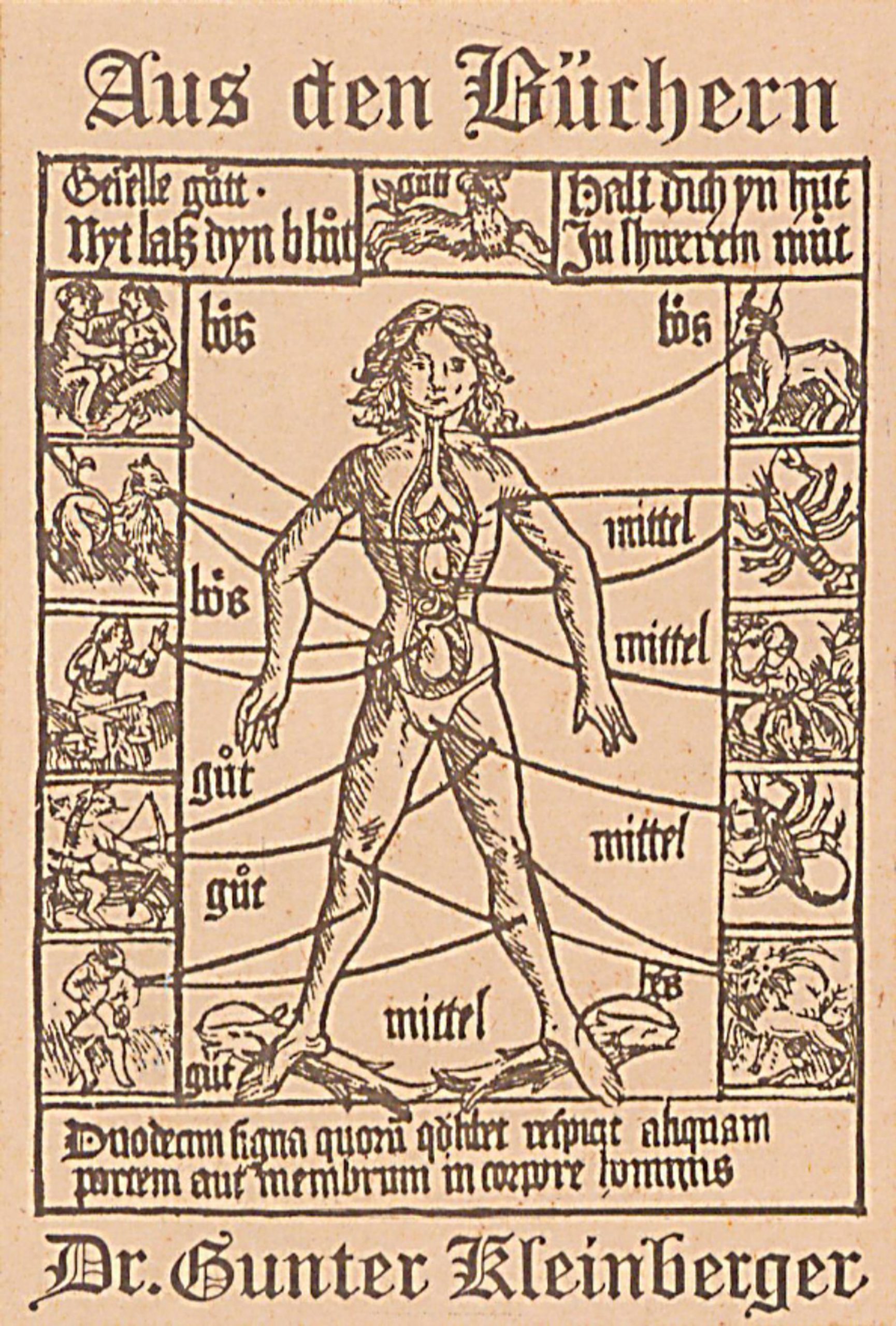 Über das Sujet verteilt steht Text in Frakturschrift, ganz oben „Aus den Büchern“ sowie ganz unten der Eignername „Dr. Gunter Kleinberger“.