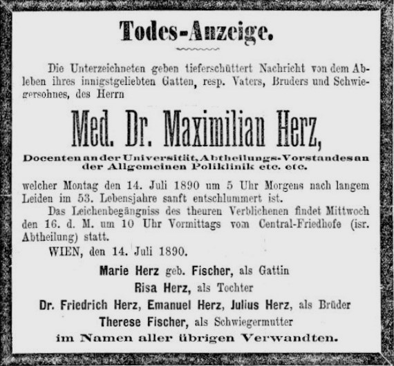 Maximilian Herz: Todesanzeige, Neue Freie Presse, 15.7.1890, S. 13.