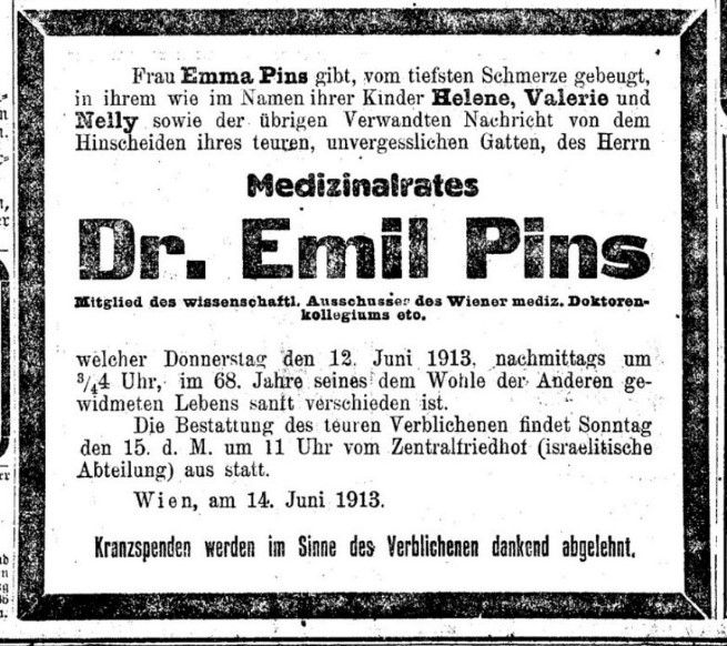 Pins Emil: Todesnachricht, Neue Freie Presse, 14.6.1913, S. 24.