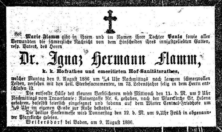Flamm Hermann: Todesanzeige, Neue Freie Presse, 11.8.1886, S. 14.